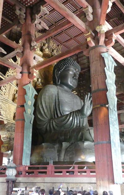 de Daibutsu hal waar de mega-Boeddha staat, werd opgezet in de 8e eeuw. Hij brandde tweemaal af ten gevolge van oorlogsgeweld. Het huidige gebouw stamt uit 1708 en is maar 2/3 van de originele grootte. Desondanks is het het grootste houten gebouw ter wereld en zeer indrukwekkend! Nog indrukwekkender is het Boeddhabeeld, de Daibatsu (Grote Boeddha) dat er in staat. Hij is 16,2 meter hoog en weegt 500 ton. Het is een zittende Boeddha in de bekende pose met de rechterhand naar voren (deze positie betekent ' Vrees niet') en de linkerhand op de linkerknie (dat betekent bescherming).