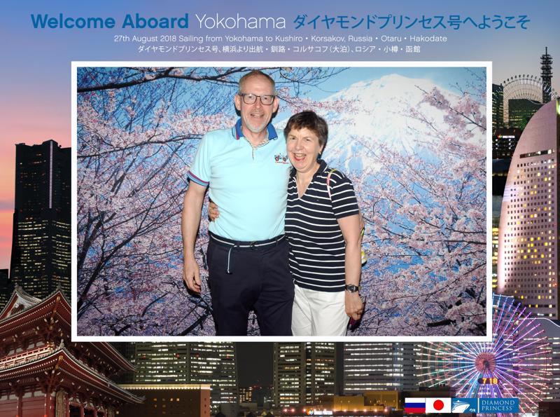 Wij zitten nog geen tien minuten of de taxichauffeur staat voor onze neus. Veel vroeger dan aangekondigd. Hij heeft een papier met ARNOLD STOUT erop, zegt verder geen woord en brengt onze bagage naar een klein busje. Wij zijn de enige passagiers. Met een noodvaart rijdt hij Tokio stad uit richting Yokohama. Wat wij van Tokio zien spreekt niet tot de verbeelding: alleen maar torenflats, enigszins shabby. Weinig groen. Snelwegen zijn gewoon middenin de stad geramd en rijden soms vlak langs de ramen van flats. Er lijkt geen enkel stedenbouwkundig plan aan ten grondslag te liggen. Het lijkt me vreselijk om in deze stad te moeten wonen. Yokohama blijkt vriendelijker, meer menselijke maat: oude gebouwen, meer groen. Om even na enen stoppen wij voor de Cruise Terminal en vanaf dat moment gaat het allemaal razendsnel. Wij hebben nog geen cabin nummer doorgekregen in tegenstelling tot de reis naar Alaska, waar wij echt een bepaalde cabin geboekt hadden. Dat nummer krijgen wij toegewezen en dan moeten wij wachten tot ons groepsnummer (20) opgeroepen wordt. Dat is vrijwel onmiddellijk. Wij komen in een lange rij terecht voor het inchecken. Maar dat gaat ook zeer snel want er zitten wel 30 mensen om daarbij te helpen. Wij hoeven geen vouchers te overleggen of een credit card, alleen onze paspoorten. Dan krijgen wij (gouden) keycards, want als terugkerend gast zitten wij nu in de Golden Circle ;)