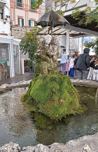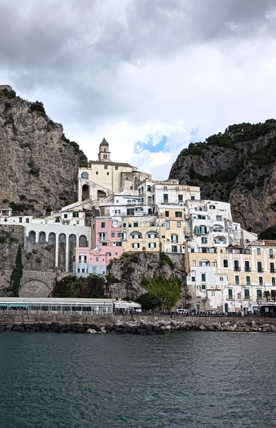 On imbarco (boarding) we were greeted by a bronzed adonis wearing only budgie smugglers. He must have been in his seventies. We sat outside on the ferry and got a great view of the coast and just as we got off it started drizzling.