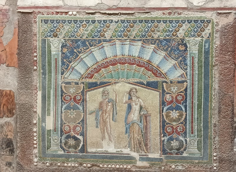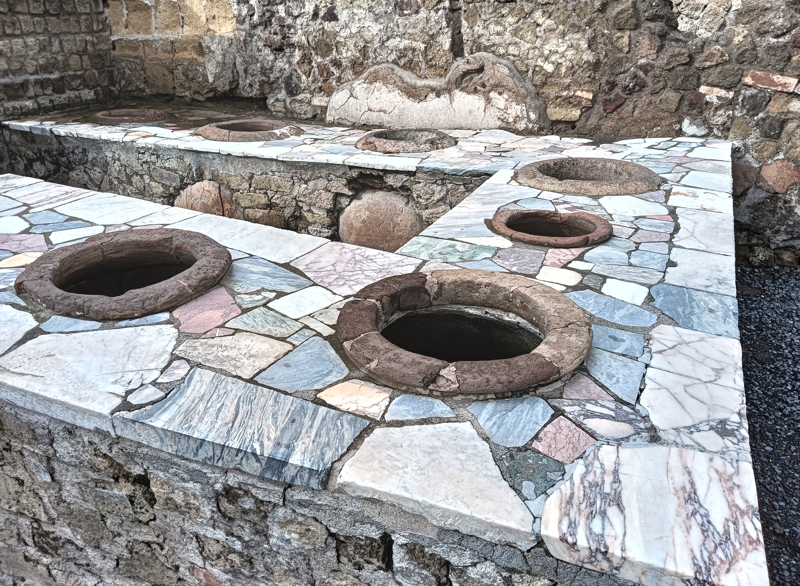 Herculaneum was about a twenty minutes drive from the port and is smaller town which suffered the same fate as Pompeii but many of the buildings are still intact and much better condition. It is fascinating and impressive to see entire villas with walls and roofs to appreciate the grandness and spaciousness. The tavernas (take away joints) with their marble tops and large embedded cooking pots feed numerous people and they even had seating areas. The thermal baths with large changing rooms with seating and shelving. We walked on mosaic tiled floors that were laid over 2,000 years ago.