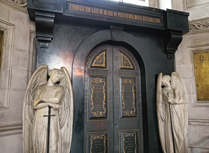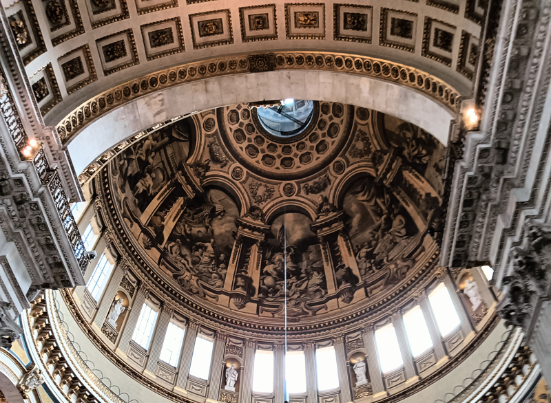 A ten minute walk from home, we toured St Pauls where Charles and Diana were married. The Cathedral has survived fires, wars (including a partial bombing) and struggles for power since its establishment in 604. The modern version we see today is substantially due to Sir Christopher Wren. We are loving his visionary architecture with huge ceilings and windows that frame the view. The dome is quite stunning but alas we didn’t have time, or inclination, to climb the 506 stairs. In the crypt there is a special chapel reserved for use for those who have been awarded MBEs, OBEs, CBEs, Knighthoods or Damehoods where they and their children can be